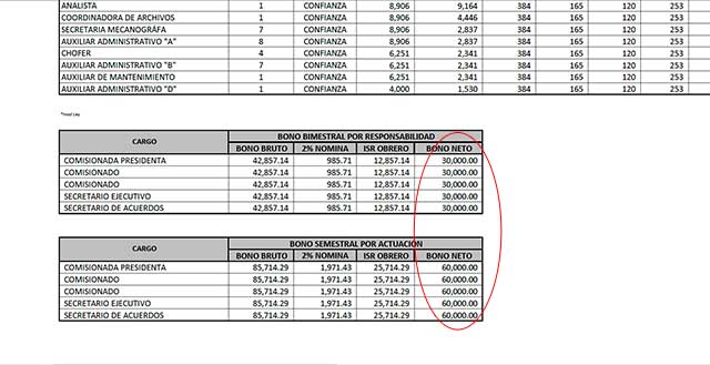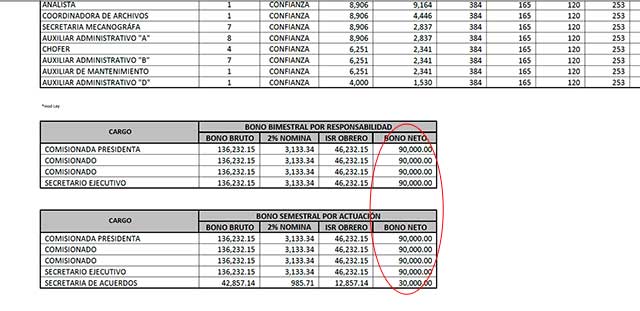 Lo que es un hecho es que a las 12:43 horas de este miércoles, en el tabulador de los salarios continuaba apareciendo el monto de 30 mil pesos por concepto de bono de responsabilidad, pero alrededor de las 13:00 horas la información fue modificada y aparecían ya los 90 mil pesos que los comisionados cobraron.