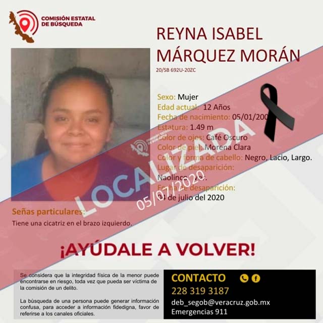 La Comisión Estatal de Búsqueda Veracruz informó que fue localizada sin vida la pequeña Reyna Isabel Márquez Morán, quien fue reportada como desaparecida el pasado sábado, en Naolinco.
