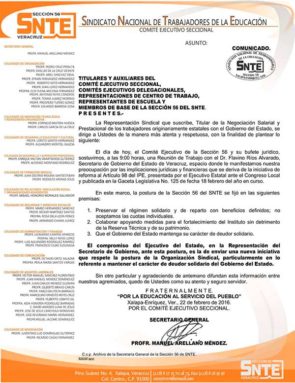 Por otro lado, en un comunicado, emitido por esta organización magisterial y dirigido a los titulares y auxiliares del Comité Ejecutivo Seccional, a los comités ejecutivos delegacionales, representantes de Centros de Trabajo y de Escuela, así como a los miembros de las bases, se señala que, como titular de las condiciones generales de trabajo, se le hizo hincapié en las graves afectaciones que traería consigo dicha reforma pensionaria.