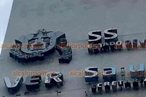 Pedazos del escudo y letras del Gobierno del Estado que estaban colocadas en lo alto de la Torre Pediátrica de Veracruz se desplomaron la noche de este lunes ante el paso del Frente Frío número 21, que trajo rachas de viento de hasta 90 kilómetros por hora.