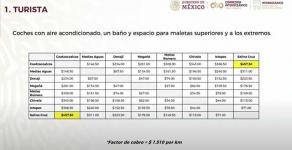 Sobre los costos, el Ferrocarril Interoceánico tendrá 3 tarifas, la turista que tendrá un precio de $457.50 de Coatzacoalcos a Salina Cruz; $608.00 en clase Ejecutivo y $1,544.50 en clase gerencial.
