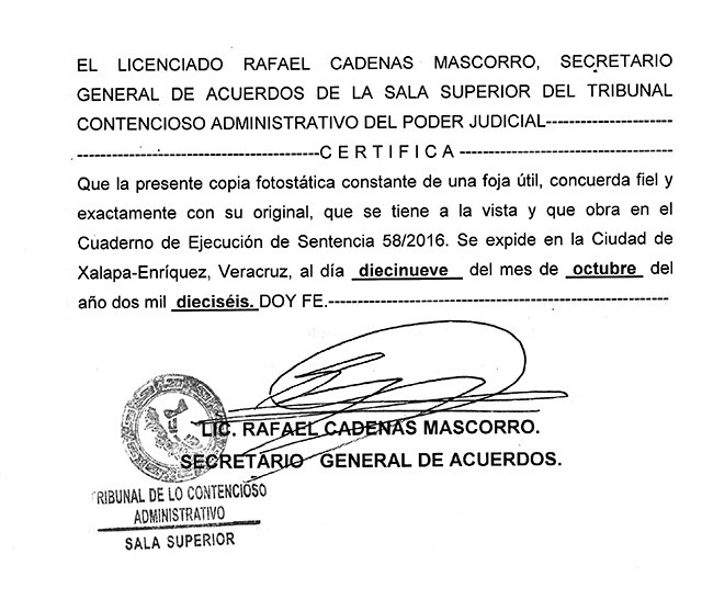 Es así que Leonardo Cruz Casas, magistrado presidente de la Sala Superior del Tribunal de lo Contencioso Administrativo del Poder judicial del Estado de Veracruz, ordenó de nueva cuenta requerir a las autoridades demandadas, es decir, al Secretario de Infraestructura y Obras Públicas y al Director General de Obras Públicas de la misma secretaría del estado de Veracruz, para que den cumplimiento a la sentencia de fecha veintiséis de noviembre de dos mil quince.