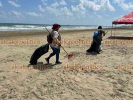 Un grupo de trabajadoras del departamento de Limpia Pública se ha encargado de mantener la playa de Coatzacoalcos libre de residuos al recorrer 5 kilómetros con su rastrillo, araña y bolsas para recoger lo que se genera al día.