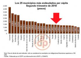En su informe “Obligaciones Financieras de los Municipios de México al Segundo Trimestre de 2018”, el Centro de Estudios de las Finanzas Públicas de la Cámara de Diputados expone que entre los ayuntamientos con una deuda per cápita por arriba de los dos mil pesos se encuentran: Cozumel, Quintana Roo (4 mil 317.7 pesos por persona); Agua Prieta, Sonora (3 mil 302.2 pesos); Solidaridad, Quintana Roo (3 mil 105.7 pesos); Puerto Peñasco, Sonora (3 mil 016.8 pesos); Nogales, Sonora (2 mil 155.1 pesos); Guaymas, Sonora (2 mil 130.3 pesos) y San Nicolás de los Garza, Nuevo León (2 mil 003.4 pesos).