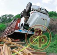 El camión volcó quedando con las llantas para arriba, cayéndole los tablones a uno de los ayudantes que iba en la caja y al volcarse la madera lo aplastó, los lesionados iban en la cabina de la unidad y sobrevivieron.