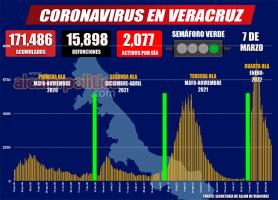 La Secretaría de Salud (SS) da a conocer que, en las últimas 24 horas, Veracruz sumó 171 mil 486 (+144 nuevos) casos confirmados de COVID-19, luego de 347 mil 890 estudios practicados.