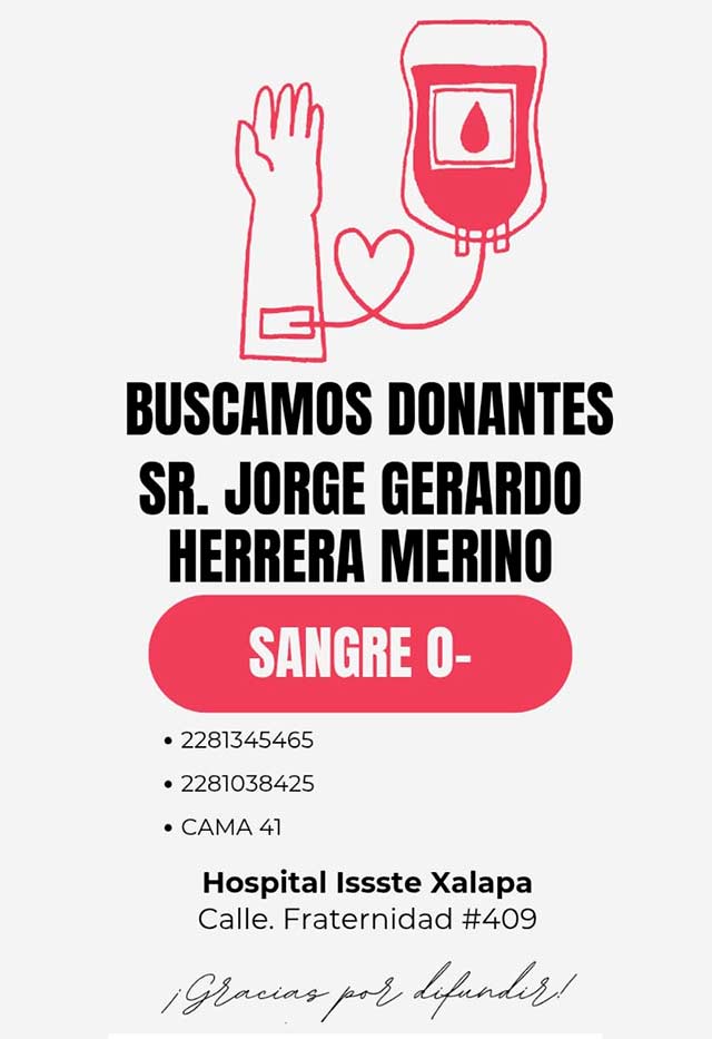 Buen día: Acudimos a su muy conocido medio para poder pedir a sus lectores donantes de sangre O Negativo para nuestro familiar Jorge Gerardo Herrera Merino que está internado en la cama 41 del Hospital ISSSTE Xalapa.