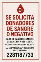 Buen día: por este medio solicitamos de manera urgente donadores de sangre tipo O negativo para el banco de sangre de la clínica del ISSSTE. Es para la paciente Juana Tosca, que la necesita con urgencia.