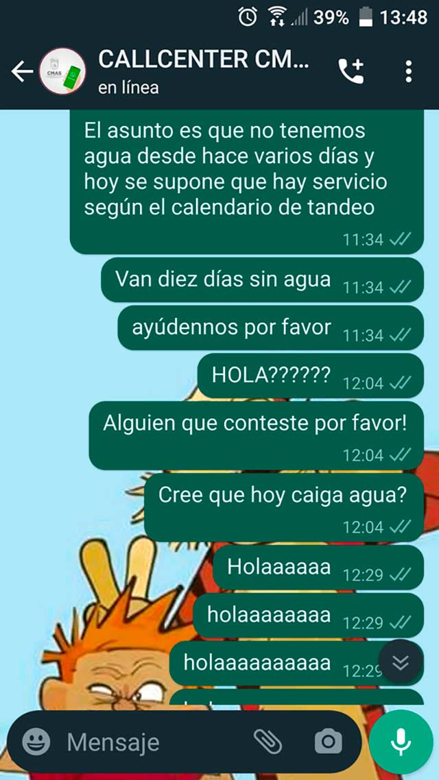 No contestan los mensajes desde la mañana, no envían pipas de agua, no dan ninguna razón. Sólo ignoran y no es justo que hagan eso.