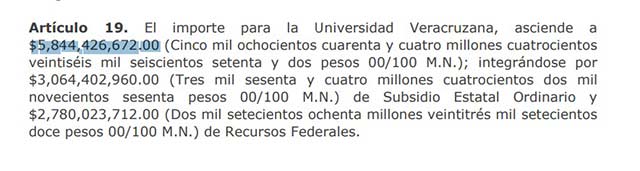 El Gobierno estatal contempla que a la UV le destinarán 5 mil 844.4 millones de pesos, con un decremento del 0.7 por ciento respecto a 2022, cuando le destinaron 5 mil 884 millones 31 mil 915 pesos, es decir, un recorte total de 39 millones 605 mil pesos.