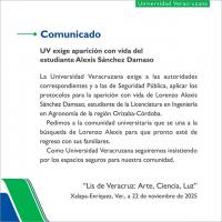 La desaparición del estudiante Lorenzo Alexis Sánchez Damaso en la localidad de Peñuela encendió las alarmas en la Universidad Veracruzana, cuya directora, Yaquelin Gheno Heredia exigió a las autoridades intervenir de inmediato para localizarlo con vida.