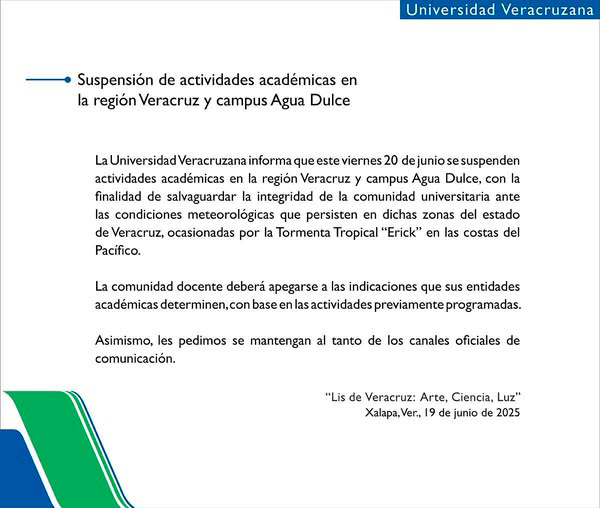La UV informa sobre la suspensión de clases para la comunidad estudiantil de la región Veracruz y del campus Agua Dulce, para este viernes 20 de junio, debido a las condiciones meteorológicas por la Tormenta Tropical “Erick”.