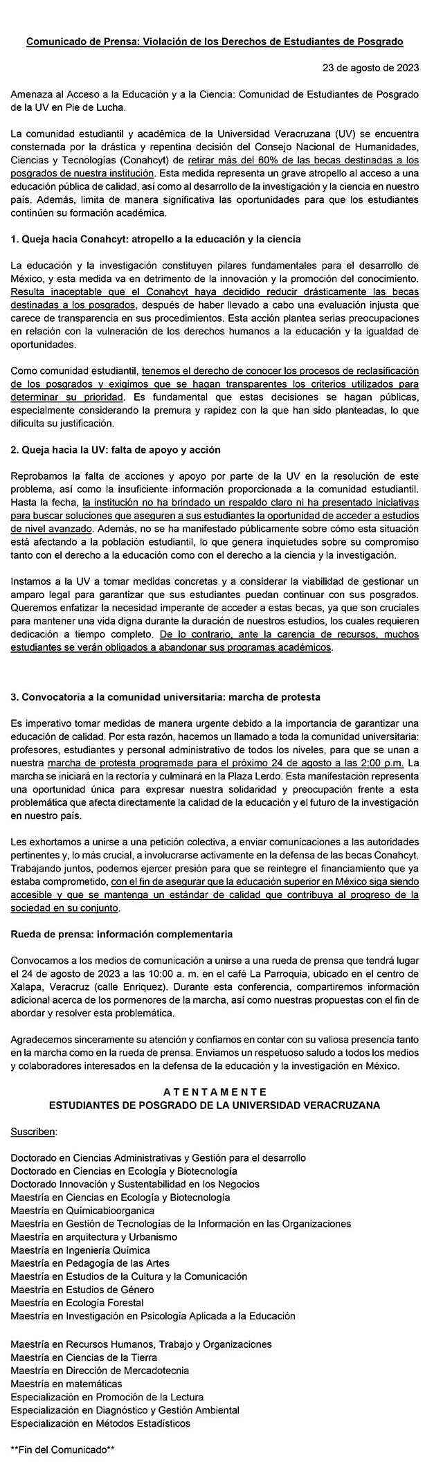Mediante un comunicado de prensa acusaron que existe una violación de los derechos de estudiantes de posgrado, puesto que el recorte se traduce en un atropello al acceso a una educación pública de calidad, así como al desarrollo de la investigación y la ciencia, limitando las oportunidades para que los estudiantes continúen su formación académica.