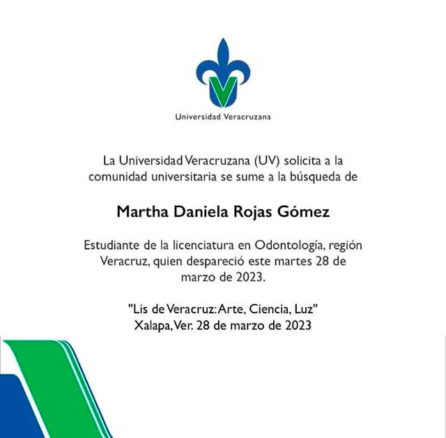 La Universidad Veracruzana (UV) hizo un llamado a la comunidad universitaria para unirse a la búsqueda de Martha Daniela Rojas Gómez, joven estudiante de la Licenciatura en Odontología de 24 años que desapareció este martes 28 de marzo de 2023 en el puerto de Veracruz.