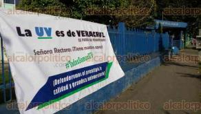 La mañana de este lunes fueron instaladas mantas de apoyo a la UV, quien reclama adeudo al Gobierno Estatal por 2 mil 76 millones de pesos desde el 2013, además de manifestarse en desacuerdo de la disminución al presupuesto del 7 por ciento respecto al ejercicio fiscal del año pasado.