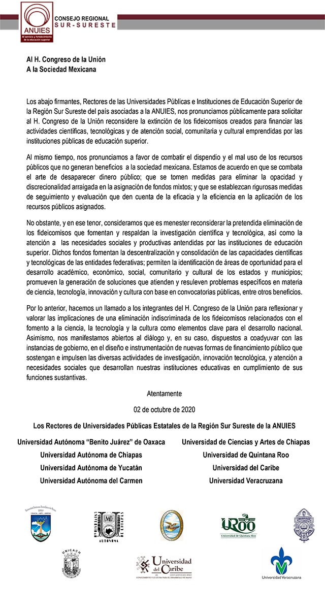 La rectora de la Universidad Veracruzana, así como sus homólogos de la Región Sur Sureste del país asociadas a la ANUIES, se pronunciaron públicamente para solicitar al Congreso de la Unión reconsiderar la extinción de los fideicomisos creados para financiar las actividades científicas, tecnológicas y de atención social, comunitaria y cultural.