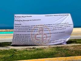 Vecinos de la colonia Puerto México colocaron una lona en el camellón central del Malecón Costero, para denunciar el abandono en el que aseguran quedaron tras la administración del exalcalde Amado Cruz Malpica y solicitar la intervención urgente del actual presidente municipal Pedro Miguel Rosaldo García.