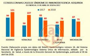 En los primeros cuatro meses de este año de 2018, el Estado de México ya superó a Veracruz en nuevos casos de SIDA al ser diagnosticadas 121 personas, cifra que también es superior a la del mismo periodo del año pasado cuando el Edomex registró 94 personas con el Síndrome de Inmunodeficiencia Adquirida.