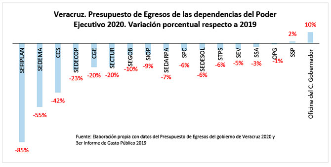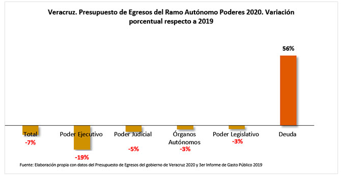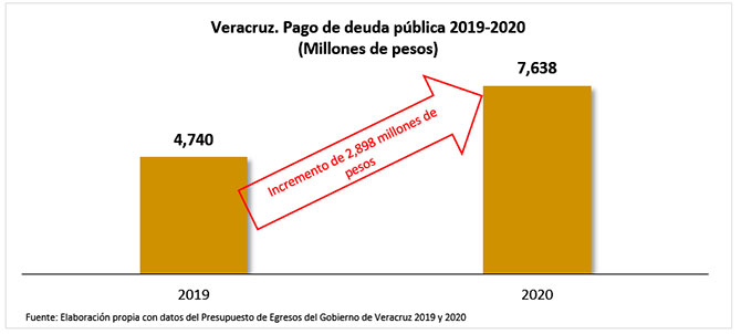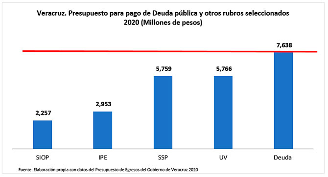 El monto para pago de deuda en 2020, es tan alto que supera el presupuesto asignado a otras áreas de vital importancia para el desarrollo del Estado como el de la UV, al cual supera en 75%. Es superior en un 133% al presupuesto de la Secretaría de Seguridad Pública, 259% superior al presupuesto del IPE y 338% al presupuesto de la Secretaría de Infraestructura y Obras Públicas.