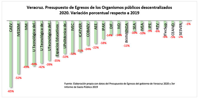 También los Organismos públicos descentralizados enfrentarán una importante caída en sus presupuestos. En mayor cuantía será la CAEV con una reducción de -65%, el INVEDEM en -52%, las Universidades tecnológicas en -44% la del Sureste, en -42% la de Gutiérrez Zamora y en -39% la del Centro. El IPE tendrá una reducción presupuestal de -9%, el DIF un -14%y el COBAEV el -24%.