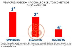 Por el número de casos denunciados en el primer cuatrimestre del año, a nivel nacional el estado de Veracruz se ubicó junto con Nuevo León, como el primero en casos de feminicidio (23); segundo en secuestros (53) y sexto en homicidios (723), de acuerdo al Informe de Incidencia Delictiva del Fuero Común del Secretariado Ejecutivo del Sistema Nacional de Seguridad Pública (SESNSP) de la Secretaría de Gobernación (SEGOB).