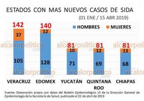 Veracruz se mantiene en el primer lugar a nivel nacional en nuevos casos de personas con Síndrome de Inmunodeficiencia Adquirida (SIDA), al registrar de enero a la primera quincena de abril 142, de acuerdo al último reporte del Boletín Epidemiológico de la Secretaría de Salud.