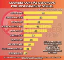 En estos 10 municipios se recibieron 583 de las mil 753 denuncias por el delito de Hostigamiento Sexual reportados a la Secretaría de Gobernación en los meses de enero a octubre del año en curso.