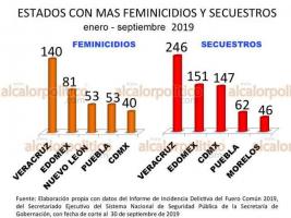 Datos de la Secretaría de Gobernación (SEGOB) indican que la entidad veracruzana se mantiene como la primera de la República Mexicana en feminicidios y secuestros, esto con base en el número de carpetas de investigación que inició la Fiscalía General del Estado (FGE), por ambos delitos cometidos de enero a septiembre del año en curso.