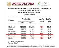 El Servicio de Información Agroalimentaria y Pesquera (SIAP) de la SADER dio a conocer que, en el Ciclo PV 2019, el Estado de Veracruz produjo 23 mil 487 toneladas de arroz, 4.7 por ciento menos que en el ciclo anterior correspondiente al año 2018, cuando produjo 24 mil 653 toneladas.