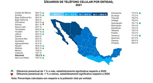 En cuanto a telefonía celular, la Encuesta refleja que un 71.5 por ciento de la población cuenta con dicho dispositivo, siendo una diferencia de 10 por ciento con relación de 2020, cuando un 66.1 por ciento de la población contó con dicho servicio.
