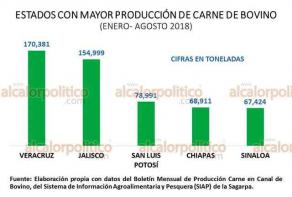El estado de Veracruz se mantiene como el primero en el país en producción de carne en canal de bovino, con 170 mil 381 toneladas producidas en los meses de enero a agosto del año en curso, de acuerdo al informe mensual del Sistema de Información Agroalimentaria y Pesquera (SIAP) de la SAGARPA.