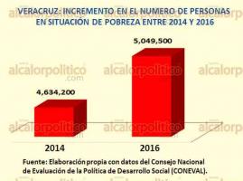 En cifras, el estado de Veracruz pasó de tener cuatro millones 634 mil 200 personas en situación de pobreza en el año de 2014, mientras que para el 2016 el número se incrementó a cinco millones 49 mil 500, esto es una diferencia de 415 mil 300 veracruzanos.
