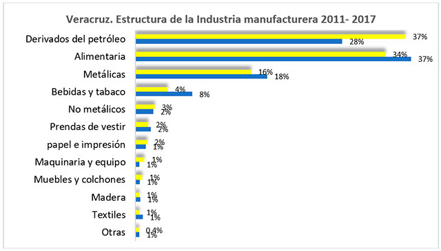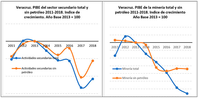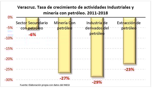De 2011 a 2018 todas las actividades productivas relacionadas con el petróleo en Veracruz sufrieron una estrepitosa caída: la extracción de petróleo mostró una reducción del -23%; la industria de los derivados del petróleo de -29%, y el Sector Minero en su conjunto (incluida la extracción de petróleo) redujo su producción en -27%.