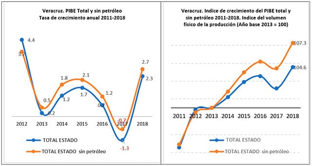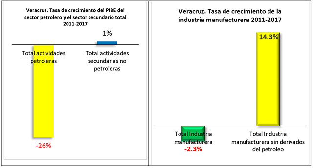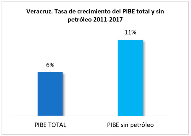 Sin embargo, a pesar del crecimiento de estos dos sectores, el crecimiento de la economía veracruzana ha sido muy escaso; de apenas 6% de 2011 a 2017, debido a que el sector petrolero es una de las más actividades de mayor peso en la economía estatal y su desempeño a la baja ejerce una enorme la influencia negativa sobre la economía estatal en su conjunto. Si no se incluye la actividad petrolera en el cálculo del Producto Interno Bruto del estado (PIBE), el crecimiento de la economía veracruzana es de 11% en el mismo período de análisis. Es decir, el sector petrolero le resta dinamismo a la economía estatal, pues sin petróleo estaría creciendo casi al doble de lo que logra con el petróleo, por lo que esta actividad, más que un apoyo al desarrollo del estado, se ha convertido en un verdadero lastre.