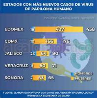 En estos cinco Estados se concentraron 857 de los mil 351 nuevos casos del Virus del Papiloma Humano del país, esto es, el 63.4 por ciento del total.
