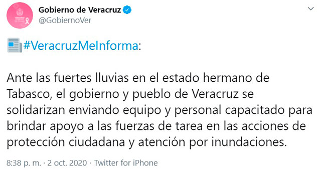 Veracruz envía equipo y personal para damnificados por lluvias en Tabasco