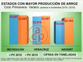 En el Ciclo Primavera–Verano 2019 y hasta el pasado mes de noviembre, los estados de la República con mayor producción de arroz eran: