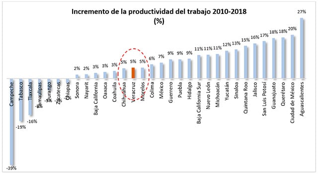 Esta situación de baja eficiencia económica ha prevalecido a lo largo de los años, pues según puede observarse, el crecimiento de la productividad del trabajo en Veracruz ha alcanzado apenas un 5% en el período 2010-2018, lo cual debe considerarse como un pobre avance, si se compara con el desempeño de Aguascalientes donde, en el mismo período la productividad, creció 27%, o Ciudad de México donde el avance fue de 20% y Querétaro y Guanajuato donde ese indicador avanzó un 18%.