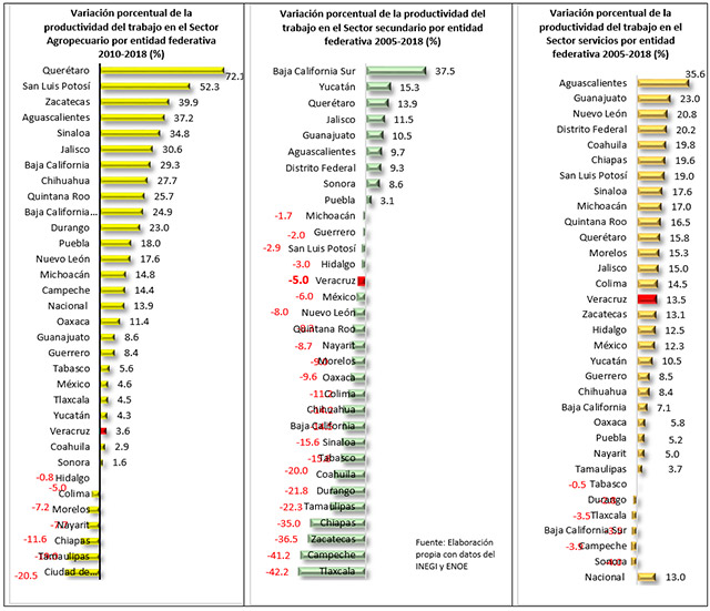 También es notorio que ha habido un estancamiento en la evolución de la productividad del trabajo en cada una de las actividades productivas. En el Sector Agropecuario, la productividad del trabajo creció apenas un 3.6% en el mismo período; incremento muy reducido que ubica a Veracruz en el lugar 24º entre los Estados de menor aumento, lejos de lo alcanzado por Querétaro con una productividad que creció 72%, San Luis Potosí donde aumentó 52.3% y Zacatecas que tuvo un incremento de 39.9%.