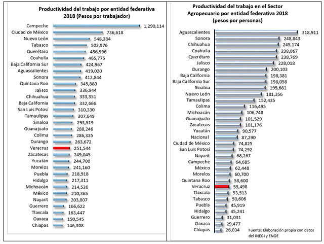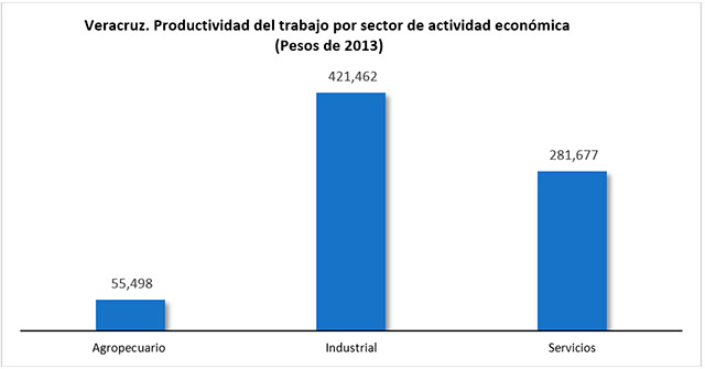 Actualmente, el valor de la productividad en Veracruz es de 251,544 pesos por trabajador al año, una de las más bajas en el país, lo que ubica al Estado en el lugar 20º entre los Estados de menor productividad; muy lejos del valor que alcanza Campeche, cuya productividad es cinco veces superior (de 1,290,114 pesos) o la Ciudad de México y Nuevo León que le superan en tres veces su valor (736,618 y 502,976 pesos por trabajador).