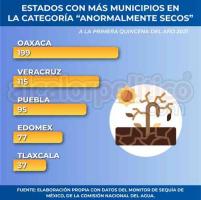 - Oaxaca, con 88 (34 con sequía severa; 54 con sequía moderada y otros 199 en la condición de anormalmente secos, esta última la cifra más alta del país)