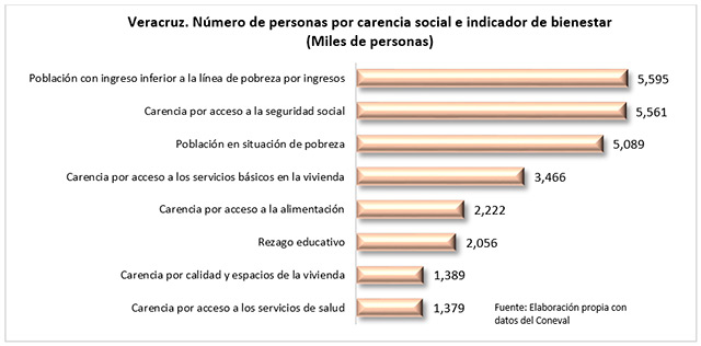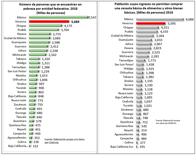 La situación es tan grave que Veracruz ocupa el segundo lugar entre los estados con más personas pobres, sólo superado por el Estado de México. Y de igual manera, ocupa el segundo lugar entre los estados con la mayor cantidad de población cuyo ingreso no les permite satisfacer sus necesidades básicas.