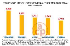 La entidad veracruzana es la primera del país en delitos patrimoniales del ámbito federal cometidos de enero a mayo, de acuerdo al número de denuncias de este tipo presentadas ante la delegación estatal de la Procuraduría General de la República (2,399), superando al Estado de México (1,392) y a la Ciudad de México (1,712), según aparece en el “Reporte de incidencia delictiva del fuero federal por entidad federativa 2012-2018”, del Secretariado Ejecutivo del Sistema Nacional de Seguridad Pública (SESNSP) de la Secretaría de Gobernación (SEGOB).