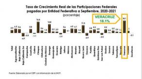 Con incremento del 18.1 por ciento al tercer trimestre de este año, el Estado de Veracruz presentó a nivel nacional el mayor crecimiento real en Participaciones Federales pagadas comparadas con el mismo periodo del año anterior, dio a conocer el Centro de Estudios de las Finanzas Públicas (CEFP) de la Cámara de Diputados.