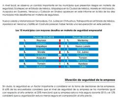 En su Séptimo informe de seguridad empresarial en México: retos y tendencias 2015-2016, Áreas geográficas de mayor riesgo, informó que las empresas han identificado a los estados de Tamaulipas, Estado de México, Michoacán, Ciudad de México, Nuevo León, Guerrero, Jalisco, Veracruz, Sinaloa y Coahuila como las entidades que representan mayor dificultad para sus operaciones en materia de seguridad.