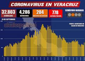 El número de positivos acumulados es de 32 mil 803 (+138 nuevos) en 204 municipios; los activos ascienden a 778 y representan el mayor riesgo por haber iniciado con síntomas en los últimos 14 días.