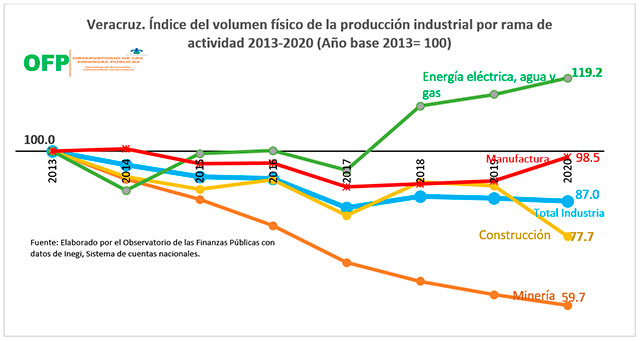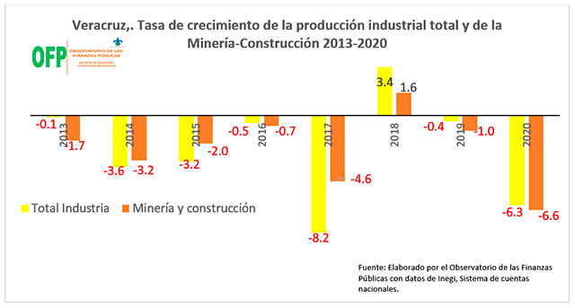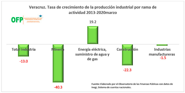 Esta crisis industrial tiene su origen en la profunda crisis de la industria de la Construcción y en la riesgosa dependencia que la industria veracruzana muestra respecto de la industria petrolera, por lo que al encontrarse ésta en una crisis estructural arrastra a una crisis generalizada, no sólo en la industria sino en toda la economía veracruzana. Y esto es una situación que no puede revertir el mejor comportamiento de la industria de la energía eléctrica, agua y gas que fue la única que creció (19%) en el mismo periodo. Lo anterior significa que la crisis de la industria veracruzana es resultado de la falta de diversificación de la producción industrial que descansa de manera excesiva en la industria petrolera, no sólo de extracción sino también de la industria petroquímica.