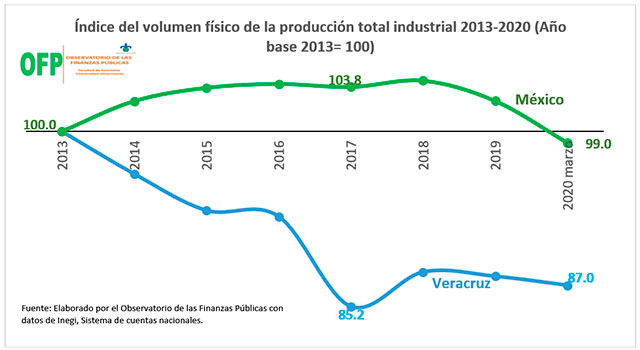 La crisis que la industria de Veracruz enfrenta no es un fenómeno generalizado, por el contrario, es un fenómeno muy particular del Estado. Esto puede comprobarse al observar que en el período 2013-2020 el índice de crecimiento de la producción industrial nacional se mantuvo al alza (sólo en 2020 muestra una reducción) En cambio la producción industrial de Veracruz se conservó una tendencia negativa durante cada uno de los años de ese mismo período.
