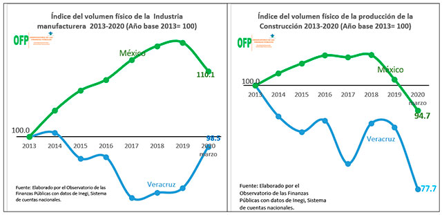 Lo mismo sucede en el caso de la industria manufacturera y en la construcción en las cuales, de igual manera, a nivel nacional el índice de crecimiento muestra una tendencia al alza en la producción, mientras que, en Veracruz, en ambas la tendencia es decreciente durante todo el período.
