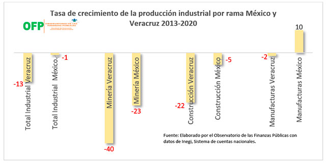 Respecto a lo anterior hay que observar el contraste entre las tasas de crecimiento de la producción industrial a nivel nacional y a nivel estatal. Así, la producción total industrial descendió -13% en Veracruz durante el período 2013-2020, mientras que a nivel nacional el descenso fue de sólo -1%. La Minería se redujo un 40% en Veracruz en el mismo período, mientras que en el ámbito nacional la caída fue de -24%. En la industria de la Construcción se observa que en el Estado hubo una reducción de -22, en tanto que en el país fue de -5%. Y finalmente en las Manufacturas la caída en el Estado fue de -2% mientras que a nivel nacional hubo un crecimiento de 10%.